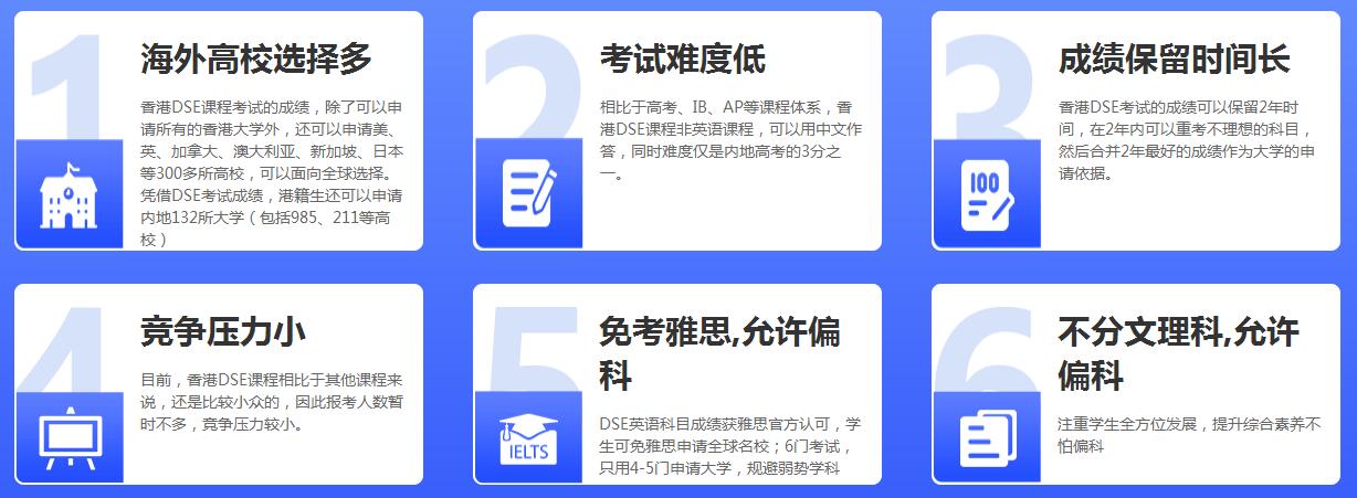 中国香港中学文凭考试(Hong Kong Diploma of Secondary Education Examination),简称DSE,也称“中国香港高考”,是由中国香港考评局于2012年起在新学制体系下建立的大学入学选拔考试。香港DSE考试优势